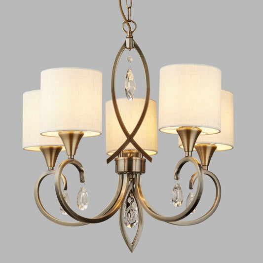 Alberto 5 Light Pendant- Antique Brass, Crystal & Linen Shades
