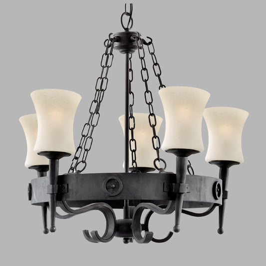 Cartwheel 5 Light Pendant - Black Iron & Sanded Glass